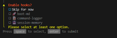 安装向导里通常会问是否开启 hooks(boot-md、command-logger、session-memory)。如果你对隐私和权限比较谨慎,建议先只开必要项,其余等流程稳定后再逐个放开。